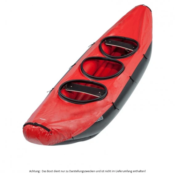 Die Spritzdecke reicht über die gesamte Bootsfläche. Inkl. 6 Spanngurten. Für die Befestigung der Spritzdecke müssen am Boot typengerechte Beschläge aufgeklebt werden. Diese Beschläge samt Kleber und ausführlicher Gebrauchsanweisung sind der Spritzdecke beigelegt. Für das Aufkleben werden ca. 1 – 2 Stunden benötigt.